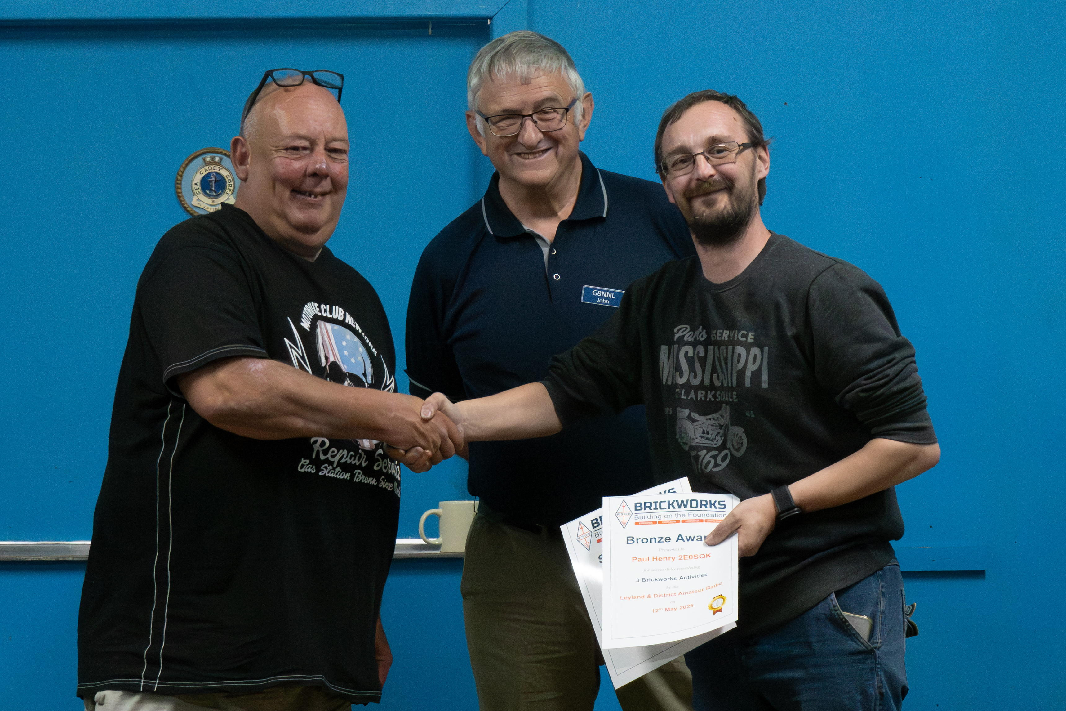 Left to Right: Steve 2E0OTG (Chairman) and John G8NNL (Brickworks HQ) presenting bronze and silver certificates to Paul 2E0SQK